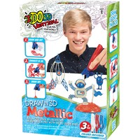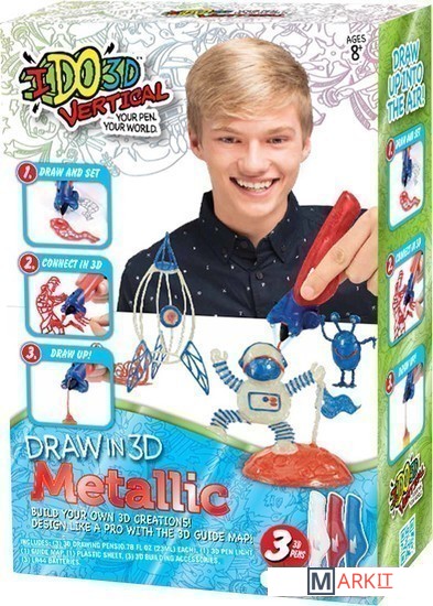 В набор для рисования входят 3 3D ручки трёх цветов с металлизированной пастой Metallic (красный, белый, синий) со съемной световой насадкой для отверждения. При помощи высококачественной пасты с эффектом металлик мальчик может создать отличные замысловатые фигурки и космические корабли.