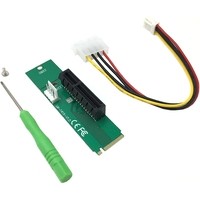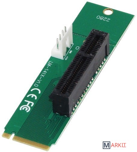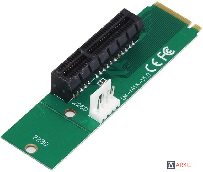 Переходник M.2 NGFF на PCI-Express, используется для преобразования интерфейса M.2 NGFF в интерфейс PCI-Express для последующего подключения райзера и видеокарты. На плате есть 3 фиксированных отверстия на 60мм и 80мм.