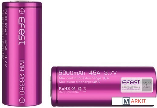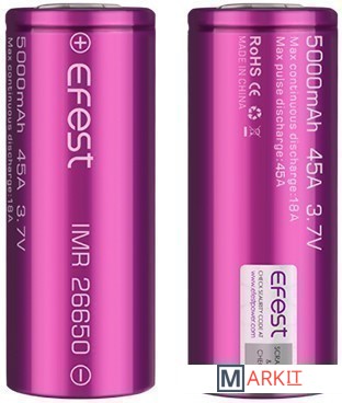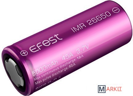 Аккумулятор к модам и варивольтам Efest IMR 26650 (5000mAh, 45А) - отличается большой емкостью и способностью отдавать большие токи. Прекрасный вариант, как для механических модов, так и для мощных вариваттов, использующих аккумуляторы типоразмера 26650.