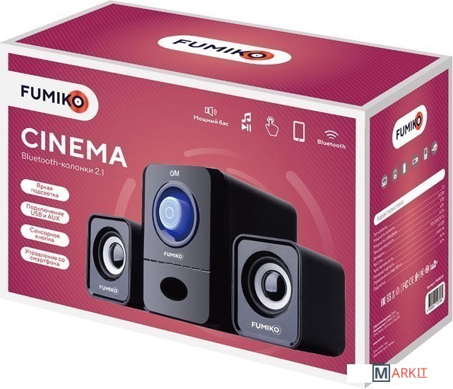 Колонки 2.1 - отличное решение для каждого, кому важен качественный и чистый звук. Модель FUMIKO CINEMA отлично подходит как для прослушивания музыки, так и для просмотра фильмов. Компактное устройство особенно пригодится владельцам ноутбуков, встроенные динамики которых не способны выдать достаточную мощность и громкость. Новейшие технологии в производстве комплектующих позволили достичь хорошего уровня громкости и чистоты звучания. С источником звука они соединяются при помощи Bluetooth. Питание происходит от USB - больше никаких лишних проводов. Любимая музыка в громком звучании теперь всегда будет с вами.Управление колонкой очень простое. Долгое нажатие на светящийся диск - включение или выключение. После этого коротким нажатием вы можете выбрать режим - AUX, Bluetooth. Подключение смартфона очень простое: включите модуль bluetooth, выберите в списке колонку CINEMA. Общая длина провода от колонки до разъема 88 смРегулировка громкости на сабвуфере спереди