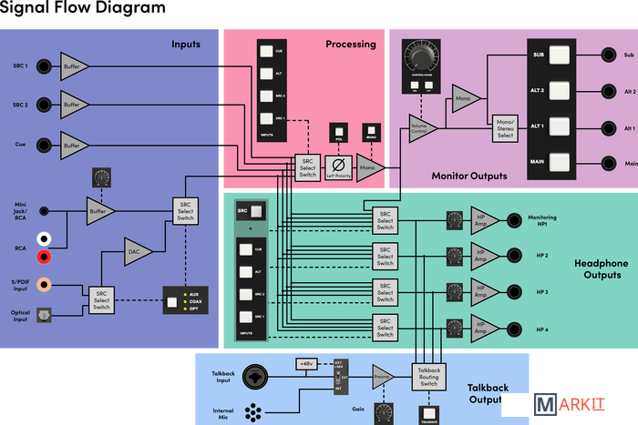 4 аналоговых стерео источника2 входа линейного уровня1 выделенный вход Cue Mix1 x вход Aux (RCA или мини-джек)Оптические и коаксиальные входы S / PDIF3 x стерео выхода на динамики1 х назначаемый вспомогательный выход4 выхода для наушников с гибкой маршрутизациейИнтеллектуальные точки касания для настройки пользователяВход обратной связиВнутренний микрофонВход внешней двусторонней связиРегулировка яркости, обрезки, моно и полярности монитора