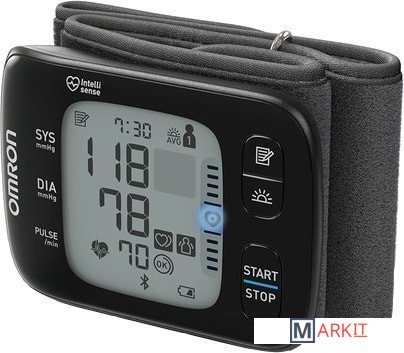 OMRON RS7 Intelli IT - тонометр на запястье без возрастных ограничений и с подключением к вашему смартфону.Основные преимущества:Подключение к смартфону, что позволяет вести дневник измерений прямо в мобильном телефоне и пересылать лечащему врачу.Благодаря запатентованной технологии Intellisense, тонометры на запястье OMRON не имеют возрастных ограничений.Индикатор положения прибора APS позволяет определить, находится ли прибор в правильном положении относительно сердца.Расчет среднего значения: пациентам с гипертензией рекомендовано опираться не на одно измерение, а на среднее значение из трех, сделанных с интервалом не менее 1-2 минут.Индикатор аритмии сработает при любых нарушениях сердечного ритма.Он идеально подойдет людям, у которых измерение на плече вызывает резкие болезненные ощущения.Легкость и компактность позволяет взять тонометр с собой на работу, на дачу или в путешествие.Память по 100 измерений для двух пользователей.Футляр для того, чтобы взять тонометр в дорогу.Каждый тонометр OMRON в процессе производства трижды проходит контроль точности, что обеспечивает надежную работу прибора.