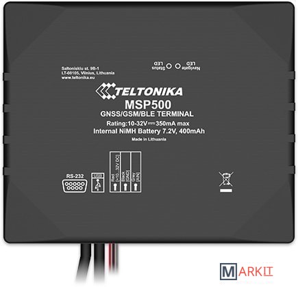MSP500 - это специальный терминал слежения с возможностью подключения GNSS / GSM / Bluetooth, внутренними антеннами GNSS / GSM, интерфейсом RS232 и встроенным Ni-Mh аккумулятором. Устройство был разработано для контроля ограничения скорости. Кроме того, устройство содержит встроенный извещатель и реле для ограничения скорости на основе переключения питания топливного насоса или управления педалью акселератора, используя дополнительный электронный контроллер дроссельной заслонки