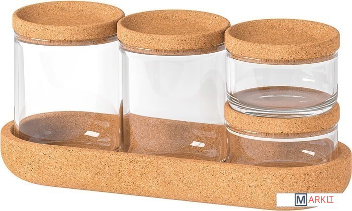 | Комплектация | 2 банки (диам. 8 см, высота 5,5 см), 2 банки (диам. 8 см, высота 11 см) и 1 поднос (длина 26 см, ширина 10 см и высота 3 см). |