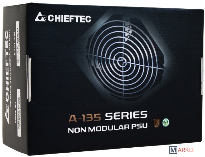Блок питания из серии A-135. Обладает сертификатом 80 PLUS Bronze и 140 мм вентилятором, КПД составляет 85%.