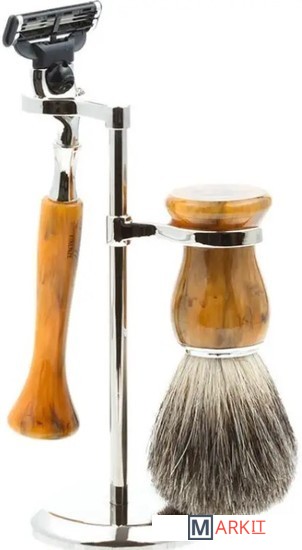Бритвенный станок, совместимый с кассетами Gillette MACH3 (одна кассета в комплекте).Помазок с барсучьим ворсом.Материал рукояти: каучуковая смола, никелированная латунь.Подставка из металлического сплава.