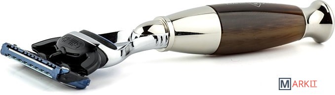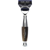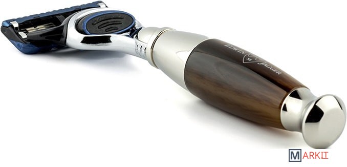 Бритвенный станок Diffusion английского бренда Edwin Jagger с системой Gillette Fusion. Ручка выполнена из акриловой смолы, имитирующей цвета рога. Все металлические элементы бритвы сделаны из высококачественной нержавеющей стали и покрыты никелем для придания особого блеска и дополнительной стойкости к коррозии. Бритва поставляется в фирменной подарочной упаковке.