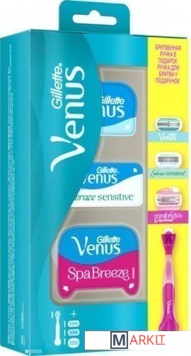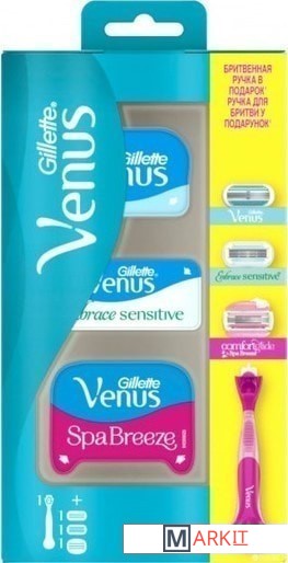 Набор включает следующую продукцию:1. Станок Gillette Venus ComfortGlide Spa Breeze 1 шт - нескользящая гладкая ручка. Легко заменяемые кассеты.2. Сменная кассета для бритья Gillette Venus ComfortGlide Spa Breeze - подвижные увлажняющие подушечки содержат легкие масла для тела и аромат белого чая, благодаря которым бритва плавно скользит по коже. Три лезвия обеспечивают качественное бритье, делая кожу гладкой.3. Сменная кассета для бритья Gillette Venus Embrace Sensitive 1 шт - идеальный вариант для чувствительной кожи. Пять плавающих лезвий и в восемь раз увеличенное количество смазывающих веществ в увлажняющей ленте обеспечивают гладкое бритье с меньшим ощущением раздражения кожи.4. Сменная кассета для бритья Gillette Venus 1 шт - это первые лезвия, специально разработанные для женщин. Три лезвия, повторяющие изгибы тела, и защитные подушечки разглаживают кожу для гладкого и чистого бритья в одно касание. Голубая полоска-индикатор меняет цвет, сообщая о том, когда пора менять лезвия Venus для обеспечения оптимального качества бритья.Любая сменная кассета Venus подходит к любой бритвенной ручке Venus, кроме Simply Venus.Наслаждайтесь гладким и комфортным бритьем.