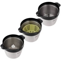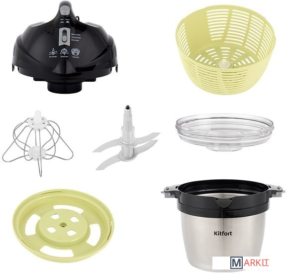 Прибор укомплектован ножом, венчиком для взбивания, корзиной для смешивания, а также крышкой чаши измельчителя для безопасной работы и крышкой съемной корзины