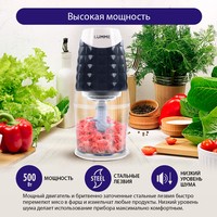 Мощный измельчитель с чашей объемом 0.6 литра. подходит для измельчения, взбивания, смешивания.2 съёмных ножа из нержавеющей стали не деформируются, не ржавеют, не подвержены коррозии, легко моются и имеют максимально длительный срок службы.Удобен и прост в использовании, занимает при хранении немного места.Мощность 500 Вт обеспечивает широкие возможности применения.Емкость чаши 600 мл позволяет готовить на всю семью.
