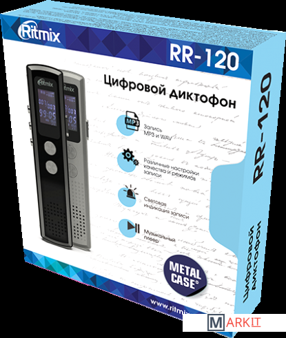 Ritmix RR-120 - это компактный цифровой диктофон в стильном корпусе из металла. Рекордер обладает функцией музыкального плеера, что позволяет слушать музыку в форматах MP3, WAV, APE, WMA, FLAC.Модель не только отличается чёткой записью благодаря встроенному высококачественному микрофону, но и поддерживает разные типы записи: WAV (битрейт 1536 кбит/сек) и MP3 (битрейт 192 кбит/сек). Универсальные форматы записи MP3 и WAV не требуют конвертации.RR-120 оснащен функцией голосовой активации записи VOR. Данная функция позволяет начинать запись автоматически при обнаружении устройством каких-либо звуков.