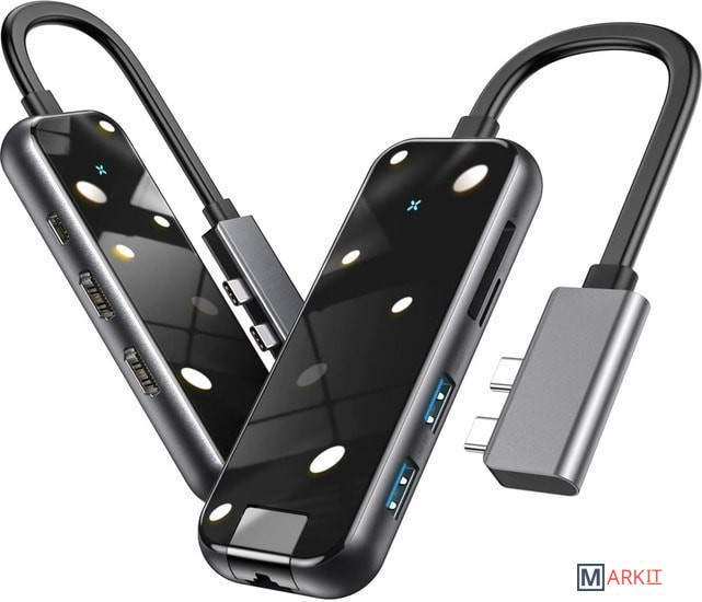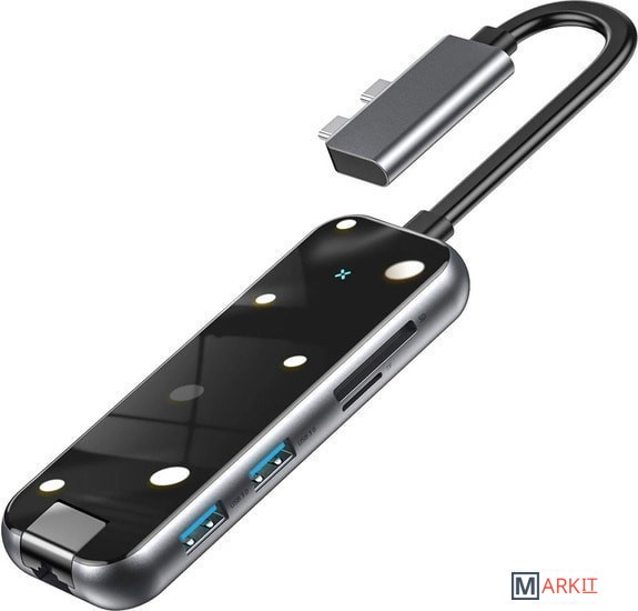 | Все разъемы на адаптере | USB-A 3.2 Gen1 (5 Гбит/с), HDMI, RJ-45, USB-C (только для зарядки) |