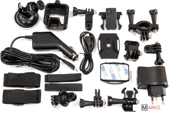- Водонепроницаемый кейс;- Быстросъёмное крепление;- Крепление на шлем;- Крепление на руль велосипеда;- Крепление - карабин;- Крепление на голову;- Крепление на пояс;- Универсальное крепление. |