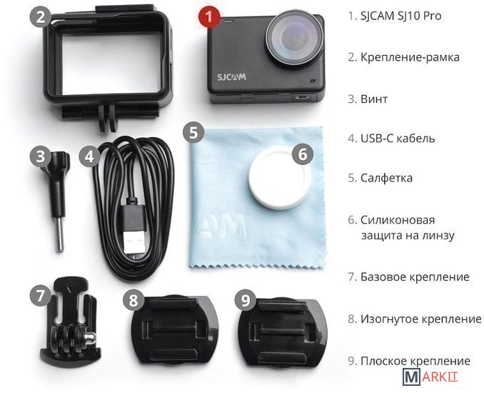Экшен-камера, Кабель USB, Крепление универсальное, Набор клейких креплений, Фиксирующий винт