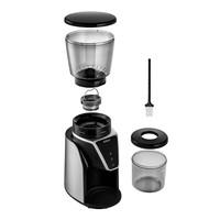 Кофемолка отличается высокой производительностью в 165 Вт, и за 1 цикл работы способна измельчить до 100 г продукта! Даёт равномерный помол и не перегревает кофе в отличие от роторных кофемолок. Нескользящие ножки делают прибор устойчивее на поверхности.У кофемолки есть LED-дисплей и сенсорное управление, что делает устройство удобным в использовании. Дисплей показывает время работы, количество чашек до 10 порций и таймер на 40 секунд. Сверху находится регулятор, где можно настроить степень помола.Длина шнура: 0.8 м.