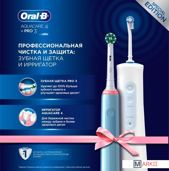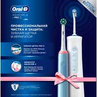 Ирригатор Oral-B Aquacare 4 Pro-Expert —это профессиональный прибор для очищения полости рта струей воды, который позволяет качественно удалять остатки пищи из межзубного пространства, а также бережно массировать дёсны. Зачастую труднодоступные участки и межзубное пространство, составляющие большую часть полости рта, остаются плохо очищенными. Это влечёт за собой не только появление неприятного запаха изо рта, изменения цвета эмали, но и более серьезные проблемы. Применение для гигиены полости рта ирригатора Oral-B Aquacare 4 Pro-Expert поможет максимально эффективно проводить профилактику возможных проблем.Преимущества использования:Технология Oxyjet: обогащает воду микропузырьками, обеспечивая лучшее очищение, уменьшая количество бактерий и микробов во рту, защищая тем самым от налёта и воспаления дёсен.Режим контролируемой подачи воды: пульсирующий режим обеспечивает очищение всех участков.4 режима для персонализации чистки:- 2 уровня интенсивности: выбирайте между обычным или слабым (для бережной чистки) напором воды для персонализации ухода за полостью рта.- 2 режима потока: концентрированный монопоток и вращательный турбопоток для бережного очищения пространств между зубами.Монопоток - прямой направленный поток для чистки межзубных пространств и брекет-систем. Турбопоток охватывает больший участок и мягко массирует дёсны, ополаскивает полость рта и удаляет остатки пищи.Улучшает здоровье десен и удаляет налет из труднодоступных мест.Защищает при наличии ортопедических и ортодонтических конструкций: бережно удаляет частички пищи в промежутках между проволокой и брекетами.Работает от аккумулятора: простота в использовании без шнуров.Щетка Pro 3 D505.513.3 имеет 3 режима чистки: ежедневная чистка, отбеливание и для чувствительных зубов.Визуальный датчик давления на десны, который сообщит, если вы слишком сильно надавите на щетку.Помогает чистить зубы тщательнее за счет встроенного 2-минутного таймера.Батарея работает более 2 недель без дополнительной подзарядки благодаря литий-ионному аккумулятору.