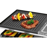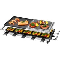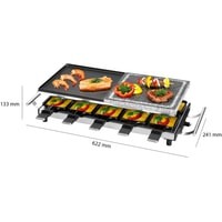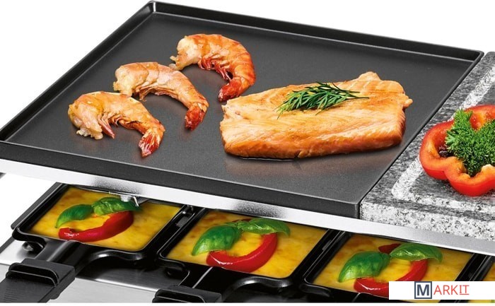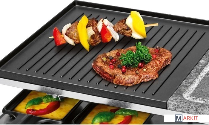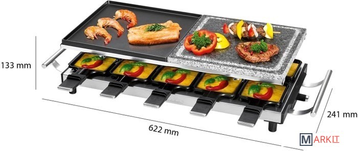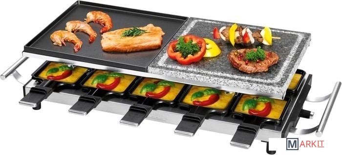 Настольный гриль-гриль 2in1 Raclette с горячим камнем и вращающейся конфоркойДля гриля и запеканияДвусторонняя твердая тарелка для гриля рыбы (гладкая поверхность) или мяса (очень глубокие бороздки для четкого рисунка решетки)Пластина для гриля из натурального камня - более здоровое и нежирное приготовление на грилеОбщая площадь гриля: прибл. 48,5 x 24 см (2x прибл. 24 x 24 см)10 маленьких кастрюль, 10 деревянных лопатокРучки из нержавеющей стали (с термоизоляцией)Плавно регулируемый термостатКонтрольная лампа (синяя подсветка)Пластина-гриль и небольшие сковороды с антипригарным покрытием.