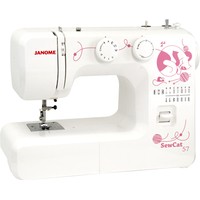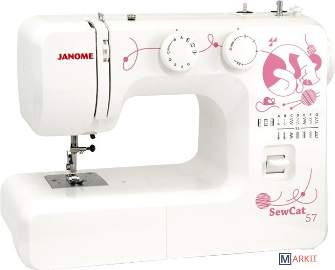 Швейная машина Janome Sew Cat 57 осуществляет 15 важнейших, наиболее требуемых операций, в том числе рабочие, оверлочные и потайные строчки, а также строчки для трикотажа и петлю-полуавтомат. Машина прекрасно работает с легкими, средними и тяжелыми тканями и весьма элементарна в обслуживании. Съёмная рукавная платформа предоставляет возможность вшивать рукава и подвергать обработке узкие детали.