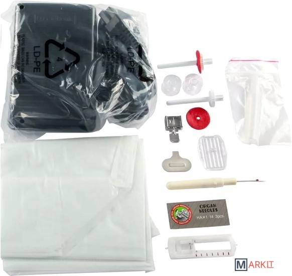 | Комплектация | вспарывательмаслоупаковка игл (3 шт.) шпульки (3 шт.)штопальная пластинаотвертка плоскаявертикальный катушкодержательфетровый амортизатор для катушекножная педальинструкция |