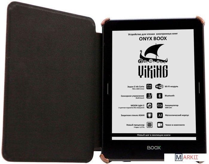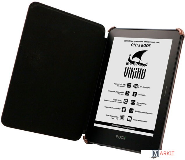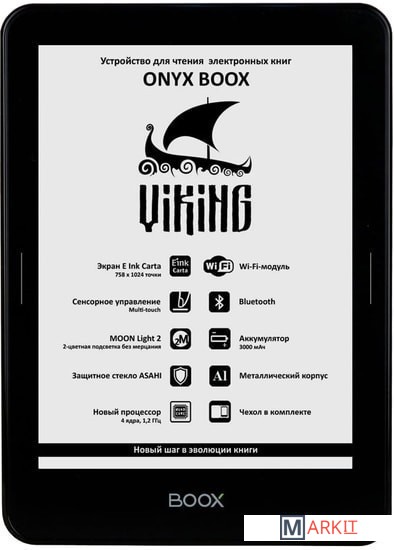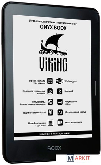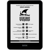 ONYX BOOX Viking — устройство для чтения электронных книг премиального класса, оборудованное экраном E Ink Carta с подсветкой MOON Light 2 и функцией SNOW Field. Модель выполнена из высококачественных материалов, имеет тонкий корпус из алюминиевого сплава и защитное стекло ASAHI. Помимо этого, ридер оснащён высокопроизводительным 4-ядерным процессором, 1 ГБ оперативной и 8 ГБ встроенной памяти. Интегрированный модуль Wi-Fi и сенсорное управление в сочетании с полноценным браузером позволяют с комфортом использовать устройство для серфинга в сети Интернет. Встроенный модуль Bluetooth позволит подключить к книге различные внешние устройства. Возможности встроенного программного обеспечения позволяют настраивать практически любые параметры текста по желанию пользователя. А операционная система Android даёт возможность устанавливать сторонние программы для чтения.