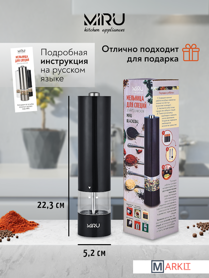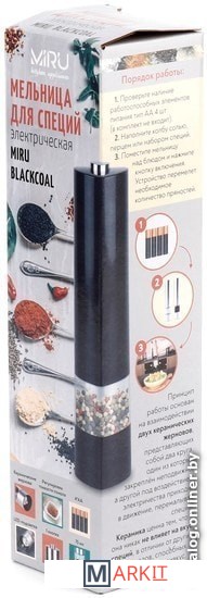 Электрическая мельница для специй **MIRU BLACKCOAL KA035 (ЧЁРНАЯ) или MIRU WHITEPILLAR KA036 (БЕЛАЯ)** станет незаменимым помощник для каждой хозяйки. Мельница электрическая для специй и приправ - электромельница для соли и перца - с подсветкой. Она способна с высокой эффективностью перемалывать соль, перец или набор специй. Для работы устройства необходимо вставить 4хAA батарейки (в комплект не входят), наполнить колбу специями и нажать кнопку включения. Устройство перемелет необходимое количество пряностей. Принцип работы основан на взаимодействии двух керамических жерновов, представляющих собой два круга, один из которых закреплён неподвижно, а другой под воздействием электричества приходит в движение, перемалывая специи. Керамика ценна тем, что она никак не влияет на вкус специй, в отличие от других материалов, способных оставить лёгкий привкус. Особенности:- Керамические жернова.- Регулировка тонкости помола.- Объём 75 мл.- LED-подсветка.- Питание от 4хAA батареек (в комплект не входит).- Удобная кнопка включения.