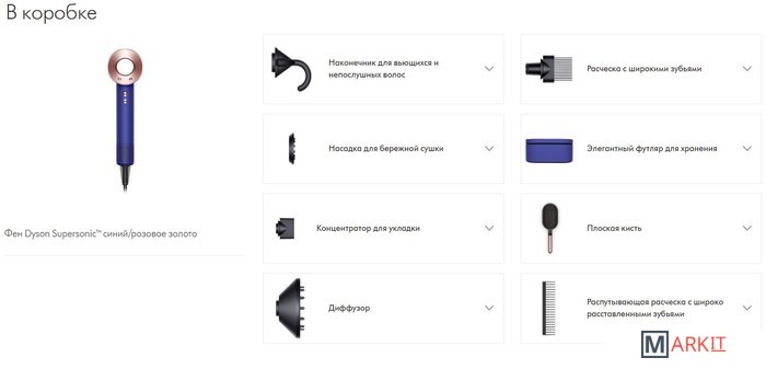 В комплекте:- насадка-концентратор- насадка-диффузор- насадка для бережного высушивания- насадка для непослушных волос- насадка-гребень с широкими зубьями- футляр для хранения и транспортировки- плоская расческа- расческа-гребень