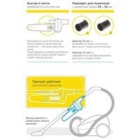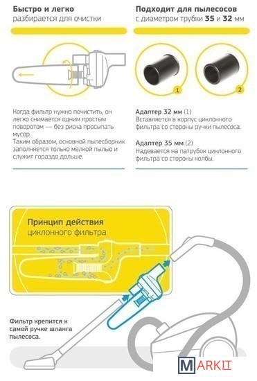 | Комплектация | циклонный фильтр, 2 адаптера для удлинительных трубок пылесоса 32 и 35 мм в диаметре |