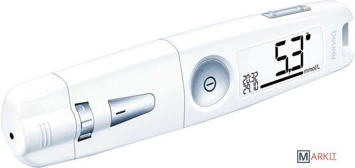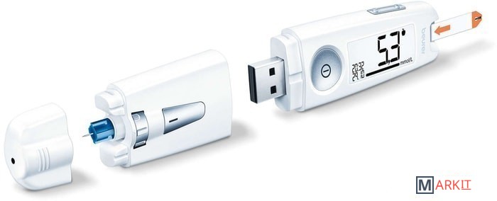 Уникальная конструкция 3-в-1:- измерительный модуль,- прокалывающее устройство,- модуль передачи данных (через USB в программное обеспечение на ПК).Особенности измерения:- 0,6 мкл - маленькая капля крови – нужен минимальный прокол,- 5 секунд - быстрое измерение,- GDH-FAD – фермент для максимальной точности,- маркировка измерения (до еды, после еды, общее),- предупреждение о кетонах.Особенности передачи данных:- используется программное обеспечение Beurer HealthManager,- возможность пересылать данные из ПО врачу,- бесплатные онлайн-консультации врача-терапевта 1 категории – проект «Доктор Beurer» (для владельцев медицинских диагностических приборов Вeurer c функцией передачи данных).Особенности расходных материалов:- 18 месяцев - срок хранения открытых тест-полосок,- тест-полоски в индивидуальной упаковке (50 штук) или во флаконах (25 шт.*2) на выбор,- стерильные ланцетные иглы G28 и G33 (универсальные – подходят для ланцетных устройств всех производителей),- стерильные ланцетные иглы G33 Soft Touch – деликатный прокол для чувствительной кожи.