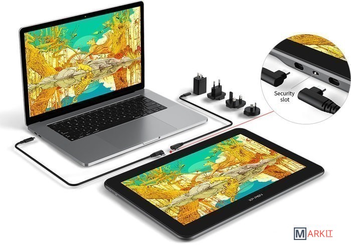 Artist Pro 16TP имеет два легкоподключаемых полнофункциональных порта USB-C с поддержкой подключения через кабель USB-C-USB-C, что дает вам аккуратный рабочий стол с минимумом проводов и больше возможностей для подключения. Дополнительный слот безопасности сбоку позволяет защитить дисплей.