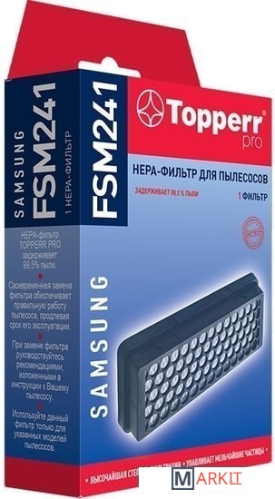 HEPA-фильтр FSM 241 для пылесосов SAMSUNG. Обладает высочайшей степенью фильтрации, задерживает 99,5% пыли. Благодаря специальным свойствам фильтрующего материала, фильтр улавливает мельчайшие частицы, позволяя очищать воздух от пыльцы, микроорганизмов, бактерий и пылевых клещей.