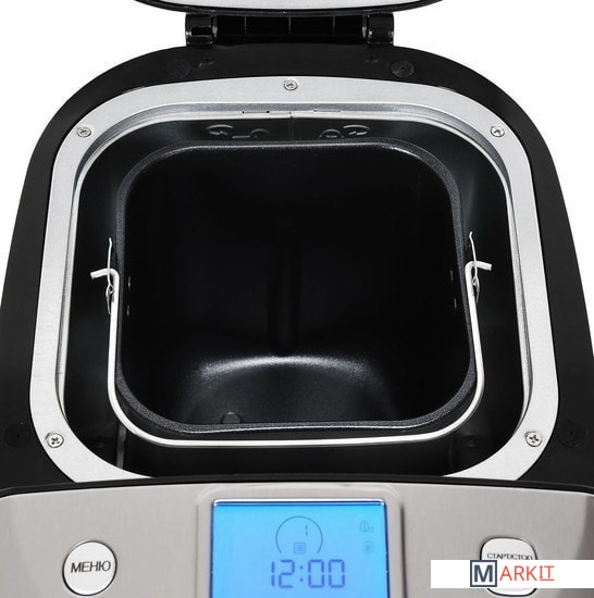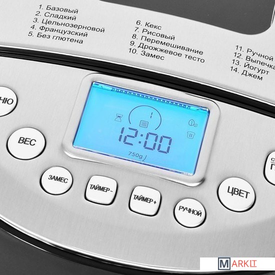 | Перечень режимов работы | 1. Базовый2. Сладкий3. Цельнозерновой4. Французский5. Без глютена6. Кекс7. Рисовый8. Перемешивание9. Дрожжевое тесто10. Замес11. Ручной режим12. Выпечка13. Йогурт14. Джем |