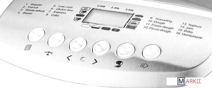 | Перечень режимов работы | - основной;- французский;- цельнозерновой - пшеничный;- сладкий;- диетический;- без глютена;- экспресс- торт;- замес;- тесто;- тесто для пасты;- тесто для пиццы;- йогурт;- джем/варенье;- выпечка;- домашний. |