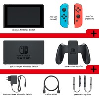 • консоль Nintendo Switch;• Joy-Con (левый) и Joy-Con (правый);• док-станция Nintendo Switch;• держатель Joy-Con;• 2 ремешка для фиксации Joy-Con на руках;• HDMI-кабель;• блок питания.