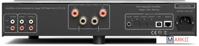 Hegel H95 — интегральный усилитель, пришедший на смену популярной модели H90. H95 использует два тороидальных трансформатора. Первый, большой, питает весь усилитель и ЦАП. А второй, малый, служит для включения и выключения усилителя. В режиме ожидания H95 потребляет только 1 Вт. Малый трансформатор позволяет включить усилитель со столь малым потреблением мощности без искажения качества звука.Наибольшее отличие между усилителями в цифровой части. H95 получил новую стриминговую плату и совершенно новый ЦАП. Новая плата привносит больше функций, например поддержку Spotify Connect. В усилители H95 используется тот же ЦАП, что и в моделях H120 и H190. Это более дорогая плата с более качественным аналоговым каскадом. Здесь также используется чип от AKM с улучшенной тактовой частотой.