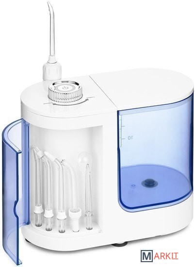 В комплекте идут различные насадки: 2 классические струйные насадки, насадка для удаления зубного камня и налёта из-под линии десны, насадка для ортодонтических конструкций, насадка с щёточкой для удаления налёта, насадка для чистки языка.Для хранения наиболее используемых насадок предусмотрен специальный отсек, который встроен в корпус сбоку и закрывается дверцей. Это очень удобно, ведь насадки будут всегда храниться в одном месте – они не потеряются.Конструкцией ирригатора предусмотрено магнитное крепление держателя насадок к корпусу ирригатора.Длина шнура: 1 м.
