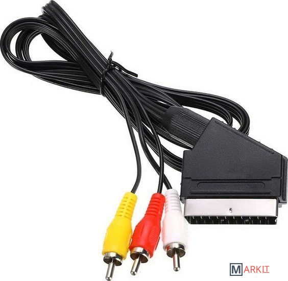 Кабель 3x RCA (AV, тюльпаны) – SCART (вход / выход), 1,5 метра, без переключателя.