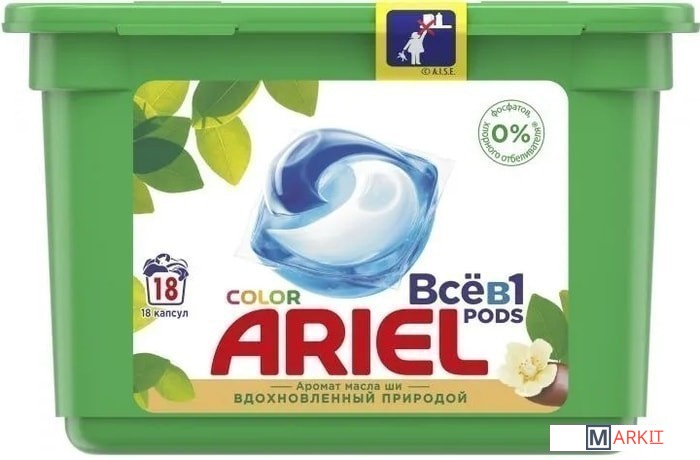 Капсулы для стирки ARIEL Pods Всё-в-1 Color Аромат масла ши - невероятная чистота в одной маленькой капсуле. Капсулы для стирки Ariel Pods Всё-в-1 Масло Ши Аромат Природы имеют уникальный многосекционный дизайн, позволяющий надежно сохранять компоненты в отдельных секциях капсулы до начала стирки, и обладают высококонцентрированными очищающими свойствами. Инновационная пленка капсул для стирки Ariel полностью растворяется при контакте с водой, позволяя мощным технологиям удалять различные виды пятен. Одна капсула содержит необходимую для стирки дозу лучшего жидкого средства от Ariel. Используйте в сочетании с кондиционерами для белья Lenor для придания дополнительной мягкости и свежести. ВНИМАНИЕ. Этот продукт может быть опасен и может нанести серьезные травмы. Храните капсулы Ariel Pods в недоступном для детей месте.Состав: >30% Анионные ПАВ, 5-15% Мыло,