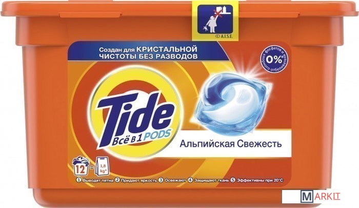 Капсулы для стирки TIDE Всё в 1 Альпийская свежесть — это потрясающая эффективность всего в одной капсуле. Кристальная чистота и никаких следов. Попробуйте инновационное средство для стирки от Tide — Tide ВСЁ в 1 PODS. Каждая капсула состоит из 3 секций — таким образом, ее ингредиенты не смешиваются до начала стирки. При контакте с водой специальная инновационная пленка растворяется, и капсула начинает свое действие: очищает, удаляет пятна, придает яркость и освежает; она эффективна уже при 20 °С. Одной капсулы хватает, чтобы полностью выстирать полный барабан грязных вещей. Tide ВСЁ в 1 PODS — это надежный выбор для удивительно эффективной стирки. Используйте вместе с кондиционерами Lenor, которые придают белью еще больше мягкости и свежести. ВНИМАНИЕ. Продукт может быть опасен. Берегите капсулы Tide от детей.Состав: >30% Анионные ПАВ, 5-15% Мыло,