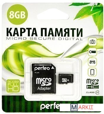 Markit » Карты памяти » Карта памяти Perfeo microSDHC Class 10 8GB + адаптер [PF8GMCSH10A]