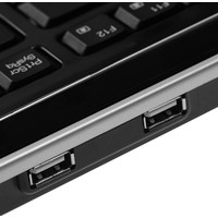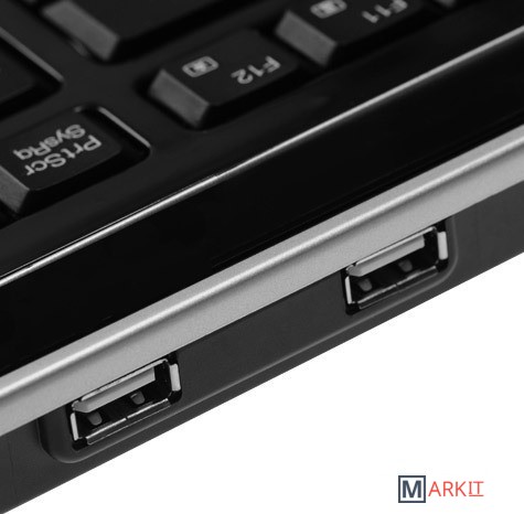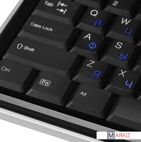 Клавиатура для ПК с интерфейсом USB, оснащенная двойным хабом. Клавиша Fn активирует управление мультимедийными функциями и популярными офисными приложениями (клавиши управления дополнительными функциями совмещены с основными клавишами).