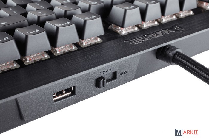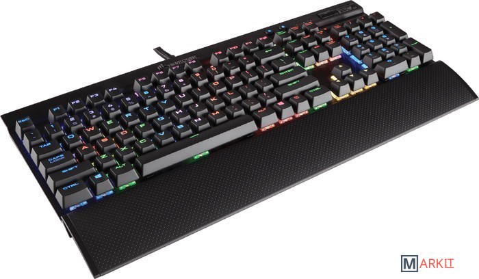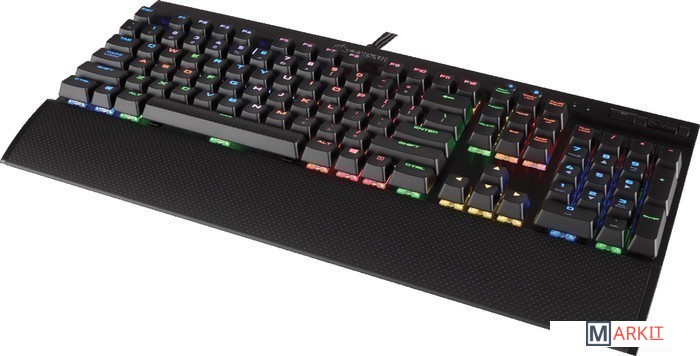Игровая механическая клавиатура с настраиваемой красной подсветкой, переключателями Cherry MX Speed и подушкой под запястья для удобства работы.