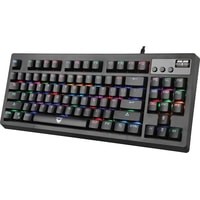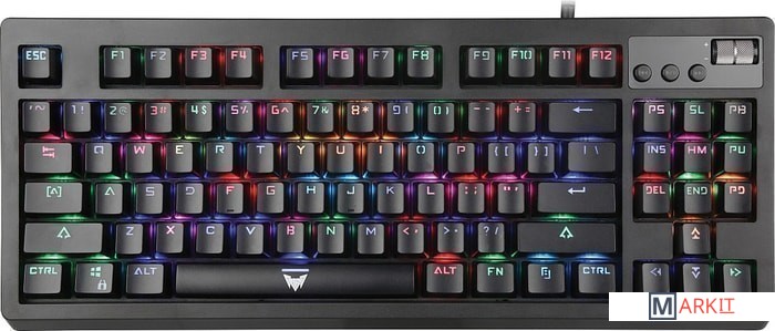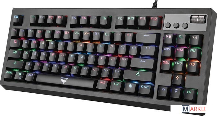 Использованы качественные переключатели OUTEMU BROWN, с тактильной отдачей, но при этом значительно тише чем BLUE. Формат TLK позволит освободить больше места для движения компьютерной мыши. Клавиши имеют внутреннюю подсветку (с нескольким профилями RGB-подсветки, в т. ч. однотонными) для удобного использования в условиях отсутствующей или слабой освещенности. Имеется 3 дополнительных клавиши для управления воспроизведением и скролл для управления общей громкостью..