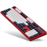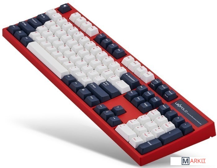 КЛАВИАТУРА БЕЗ КИРИЛЛИЦЫТип: тактильныйСила нажатия: 65 грамм (тяжелые)Длина пути: 4 мм (2 мм до срабатывания)Данная модель имеет красно-белую расцветку с тёмно-синими клавишами-модификаторами — очень смелое и яркое цветовое решение. Клавиатура собрана добротно и монолитно, а сочетание высококачественных double-shot PBT клавиш с переключателями Cherry MX и звукопоглощающей подложки позволяет сделать печать на клавиатуре максимально тихой (насколько это возможно для механики). Mini-USB порт спрятан в центре под корпусом, а на самой клавиатуре имеются центральная и две боковые канавки под кабель.Клавиатура поддерживает сочетание клавиш для регулировки громкости и управления музыкой, также имеется возможность переключения между 6KRO и NKRO.DIP-переключатели на задней панелиДают возможность поменять местами функции кнопок Ctrl и Caps Lock, Windows и Alt, Windows и Fn или отключить Windows.Звукопоглощающая подложкаПоглощает звуки при нажатии, делая процесс печати более тихим по сравнению с обычными механическими клавиатурами.Низкопрофильные клавиши Step-Sculpture2Данные клавиши заметно ниже и имеют оптимальный угол наклона, из-за чего, по отзывам, печатать приятнее и комфортнее, чем на более высоких клавишах.Клавиатура совместима с Mac OSFN-слой работает (кроме клавиш F6, F8, F9), а поменять местами клавиши-модификаторы можно в системных настройках. Проверено с MAC OS 10.13Функция Full N-key Rollover по USB (NKRO)Позволяет нажимать одновременно неограниченное количество клавиш. Для печати идеально подойдет как 6KRO, так и NKRO, независимо от вашей скорости. Для игр NKRO будет плюсом и неважно, нажимаете ли вы больше 6 кнопок или нет, поскольку, играя в любую игру, вы можете случайно нажать пару лишних клавиш и из-за этого клавиатура имеет шанс не среагировать на нажатие, которое вы хотели совершить изначально. Имеется возможность переключения между NKRO и 6KRO через FN сочетания.