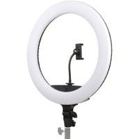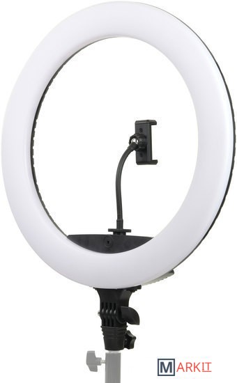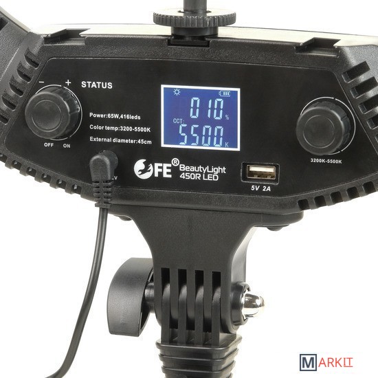 Falcon Eyes BeautyLight 450R LED – компактный биколорный кольцевой осветитель Ø45 см, на световой панели которого расположено 416 светодиодов «теплого» и «холодного» света, с плавно регулируемой цветовой температурой и мощностью светового потока от 10 до 100% (65 Вт).В осветительном приборе предусмотрены 5 динамических световых спецэффектов, которые разнообразят видеоряд и сделают съемку креативнее.Держатель смартфона, пульт дистанционного управления и сумка для переноски осветителя входят в комплект.Кольцевые осветители серии BeautyLight используются в качестве источника постоянного света различных сферах фото- и видеопроизводства.Такие осветители пользуются большой популярностью у блогеров, косметологов, визажистов, фотографов и видеографов, в задачи которых входит съемка людей крупным планом. Кроме того устройства часто задействованы в предметной съемке, записи мастер-классов, обзоров и многого другого.Мягкое бестеневое освещение выравнивает тон лица, сглаживает неровности и представляет объект съемки наилучшим образом. Кольцевая форма создает интересные блики в глазах или на блестящих поверхностях.