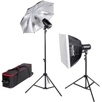 Комплект студийного оборудования Godox E120-F состоит из двух моноблоков Godox E120, двух стоек Godox 304, одного софтбокса SB-MS6060, одного фотозонта UB-002, шторок с набором фильтров BD-03, комплекта радиосинхронизации Godox RT-16 и сумки Godox CB-04