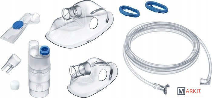 Ингалятор, распылитель, трубка-удлинитель, мундштук, маска для взрослых, маска для детей, насадка для носа, нозальный душ, запасной фильтр, сумка для хранения, данная инструкция по применению