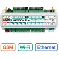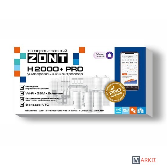 Контроллер автоматически управляет системой отопления и горячего водоснабжения любой конфигурации и сложности без ограничения числа управляемых контуров. На базе контроллера ZONT H2000+ PRO строятся как системы диспетчеризации котельной, так и полноценные системы безопасности, ситуационного управления инженерным и электрическим оборудованием.Прибор предназначен для создания максимально комфортных условий проживания в домах и полностью контролируемых процессов в зданиях производственного и промышленного назначения.Прибор является улучшенной версией контроллера ZONT H2000+ и соответствует профессиональным стандартам ZONT.Контроллер ZONT H1000+ PRO стоит выбрать для: автоматического контроля режимов работы прямых и смесительных контуров системы отопления; контроля режимов работы и технического состояния котла; контроля заданных и текущих температур и оперативного изменения их значений;автоматизации работы компонентов инженерной системы с удаленным управлением и контролем;запрограммированного управления элементами домостроения;удаленного управления приборами;мгновенного оповещения при возникновении аварии котла, при отклонении текущих параметров от заданных значений;контроля и автоматического реагирования системы безопасности и охраны.GSM-модем встроенный, поддерживает 2GЧастотный диапазон 800, 900, 1800, 1900 MHzУправляемые выходы:8 релейных выходов4 универсальных входа/выхода «открытый коллектор» 8 входов NTC 2 аналоговый выхода 0-10 ВВстроенные адаптеры цифровых шин:2 шт. встроенных универсальных (протоколы):OpenThermE-BusBridgeNet (Ariston)NavienBSB (Baxi)Комплектация датчиками NTCВстроенный резервный АКБКнопка перезагрузкиГабариты корпуса 235 х 90 х 60 мм