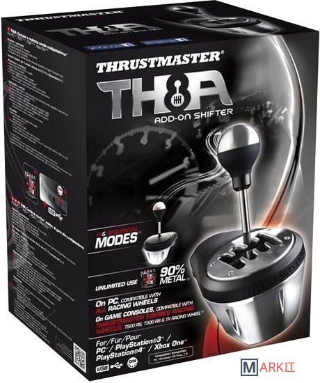 Коробка переключения передач ThrustMaster TH8A, совместимая с настоящими универсальными рукоятками (приобретаются в магазинах с аксессуарами для тюнинга машин). Поддерживает два разных стиля вождения: 1) типа H (7+1); 2) секвенционная (+/-).- Регулируемое сопротивление при переключении передач.- Регулировка направляющей и поворот в пределах 360°.- Регулировка крепежной системы и поворот в пределах 360°.- Оптимизированная система крепления для любой поверхности: столы и полки толщиной от 1 до 55 мм; кокпиты (готовые резьбовые отверстия + съемный зажим).