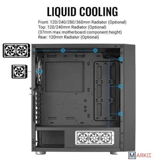 Передняя панель: 120/240/280/360 мм радиатор (Опционально)Верхняя панель: 120/240 мм радиатор (Опционально) (Макс. высота материнской платы 37 мм)Задняя панель: 120 мм радиатор (Опционально)