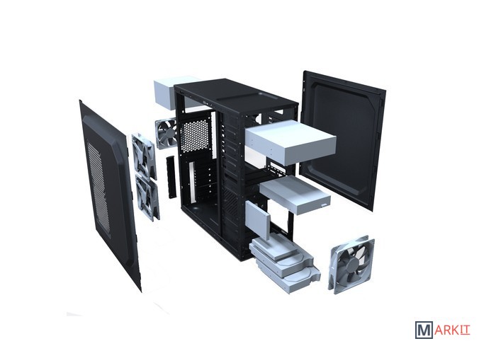 Место для установки вентиляторов 80-92-120 мм на задней стенке корпуса, место для установки 80-92-120 мм на передней стенке, место для установки 2-х вентиляторов 80-92-120 мм на боковой стенке.